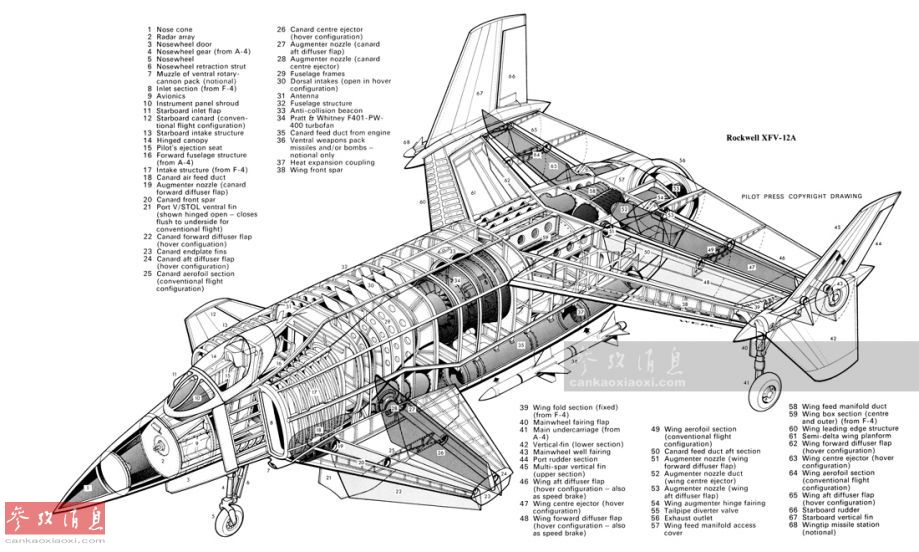 进入20世纪80年代,美国罗克韦尔公司集中研发了一种名为”引射式增升技术“(在机翼和鸭翼上安装百叶窗式进气装置和喷气导管)的新型推力矢量控制技术, XFV-12试验机就采用了该技术。图为XFV-12剖面图。