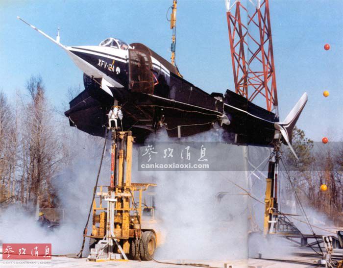 图为罗克韦尔公司的XFV-12试验机在进行垂直起降测试。可惜在经过多次试验后,该试验机都未能在垂直起降阶段保持足够的推力留空飞行,最终该项目于1981年被取消。