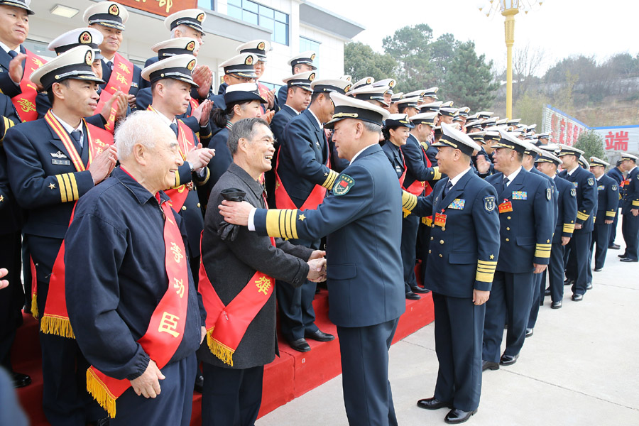 12月29日上午,中央军委委员、海军司令员吴胜利在“海空雄鹰团”命名50周年纪念大会前与海军新老英模亲切握手。钟魁润 摄