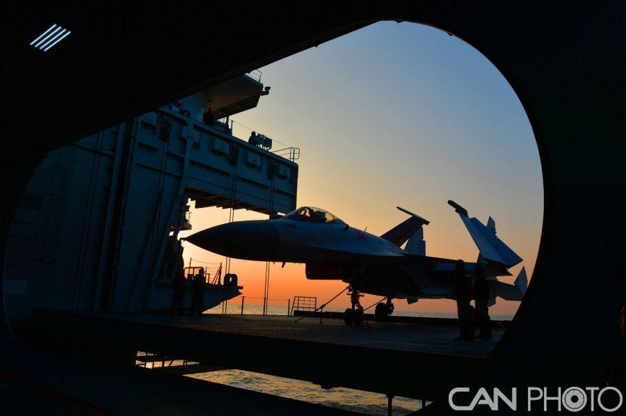 组图:歼15舰载机演练低光照条件下着舰