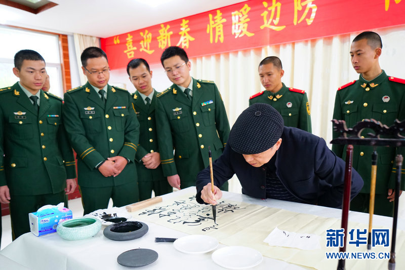 近日,广西崇左边防支队凭祥边境检查站邀请中国美术家交流协会副主席阮成森、中国书法家交流协会理事胡凌走进部队,为官兵挥毫泼墨。