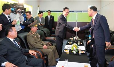 2014年10月4日,仁川,韩国国务总理郑烘原(右)与朝鲜劳动党中央书记金养健会面时握手。