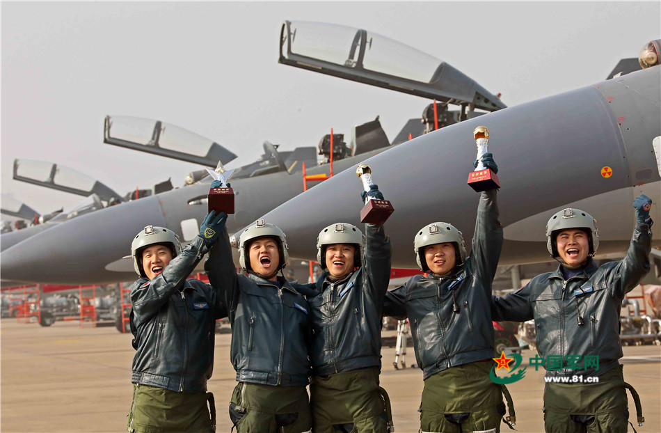 2015年12月26日,飞行员将刚刚获得的空战能手奖杯高高地举起。谭超 摄