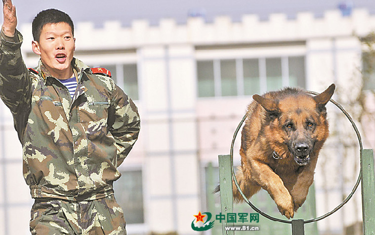 资料图:张楠在训练警犬。