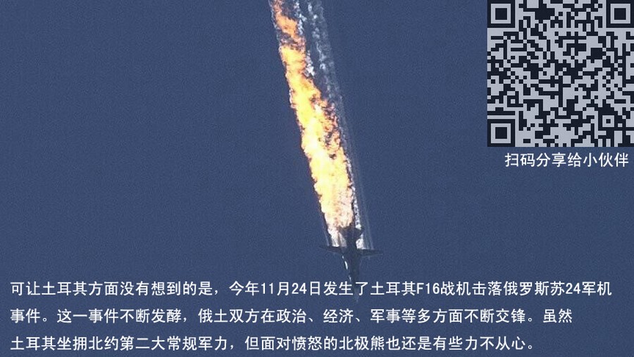 可让土耳其方面没有想到的是,今年11月24日发生了土耳其F16战机击落俄罗斯苏24军机事件。这一事件不断发酵,俄土双方在政治、经济、军事等多方面不断交锋。虽然土耳其坐拥北约第二大常规军力,但面对愤怒的北极熊也还是有些力不从心。