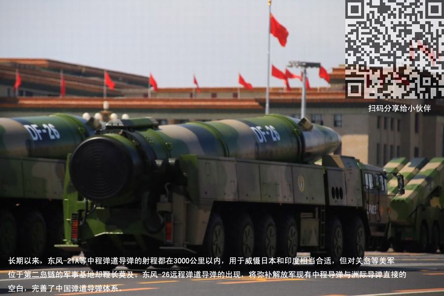 长期以来,东风-21A等中程弹道导弹的射程都在3000公里以内,用于威慑日本和印度相当合适,但对关岛等美军位于第二岛链的军事基地却鞭长莫及。东风-26远程弹道导弹的出现,将弥补解放军现有中程导弹与洲际导弹直接的空白,完善了中国弹道导弹体系。