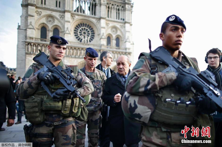 当地时间2015年12月30日,法国巴黎,法国国防部长Jean-Yves Le Drian亲自走上街头视察新年前夜的安保工作,法国士兵持枪守护左右。