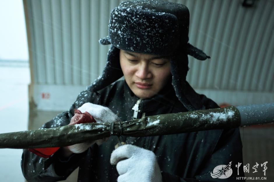 战争不会选择天气,必须时刻保持战机处于良好状态,做好随时起飞迎敌准备。机务官兵冒雪检查飞机。孙瑞杰 摄