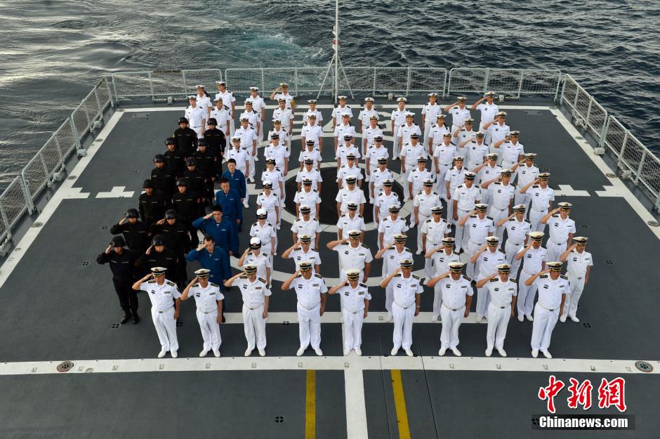 1月1日上午,中国海军第22批护航编队官兵在大庆舰举行了升旗仪式,庆祝2016年元旦的到来。图为官兵向国旗庄严敬礼。中新社发 张海龙 摄