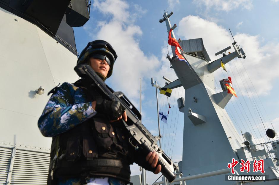 1月1日上午,中国海军第22批护航编队官兵在大庆舰举行了升旗仪式,庆祝2016年元旦的到来。图为特战队员加强警戒值班。 中新社发 张海龙 摄