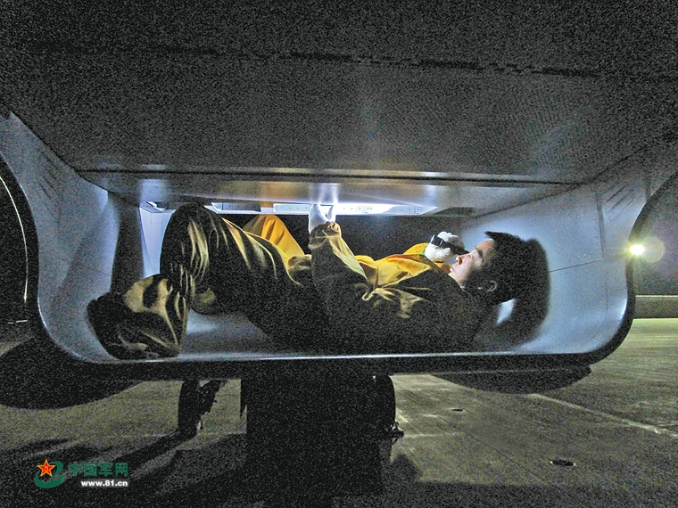 1月1日凌晨5时,红土高原还未从寒冷的睡梦中苏醒,担负战备值班任务的机械员、四级军士长帅红平已经钻进了他的战位,他要和战友们一起,在天亮之前完成对战备值班飞机的检查准备工作。(四级军士长张杨有摄)