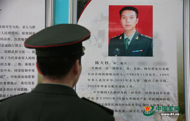 陈大桂,第二炮兵某部原排长。在“5·12”汶川特大地震中舍生忘死救出11名少数民族群众后,与奶奶、父母、妻子杨欢和四名未被救出的村民不幸被滑塌的山体掩埋,壮烈牺牲。他用热血和生命谱写了一曲少数民族基层党员干部对党忠诚、民族团结的壮丽凯歌。党中央、国务院、中央军委联合追授陈大桂“全国抗震救灾模范”荣誉称号。