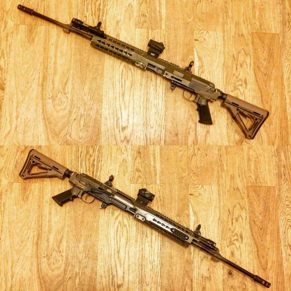 这支枪采用深色涂装,安装了艾姆波音特瞄准镜和折叠式机械瞄准具。
