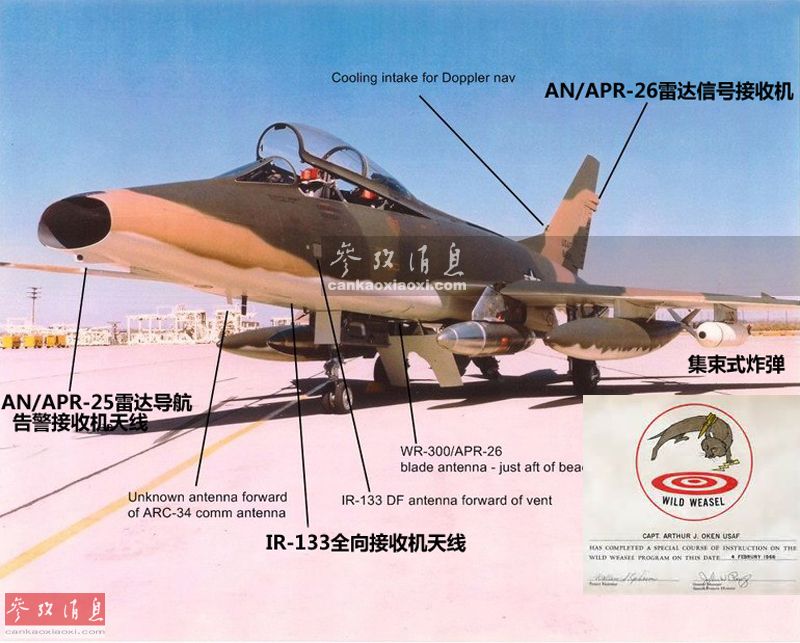 由于战机损失数量直线上升,美空军开始将双座型的F-100F战机改装为专用的SEAD战机,F-100F作为第一代“野鼬鼠”(野鼬鼠I)战机应运而生。美军在该型机上加装了多种地空导弹雷达探测装置。小图为最早一批通过“野鼬鼠”训练课程的F-100F飞行员获得的资格证书,可见上面有一个野鼬鼠的卡通画,分别手持导弹和闪电,很形象地代表了针对敌方防空系统的软、硬两种杀伤方式。