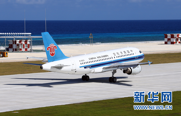 1月6日10时21分,南方航空的飞机降落南沙永暑礁新建机场。当日,中国政府征用的两架民航客机先后从海口美兰机场起飞,经过近2小时的飞行于10时21分、10时46分平稳降落南沙永暑礁新建机场并于当日下午返回海口,试飞成功。永暑礁新建机场位于我国南沙永暑礁上,是我国目前最南端的一座机场。 新华社记者 査春明摄