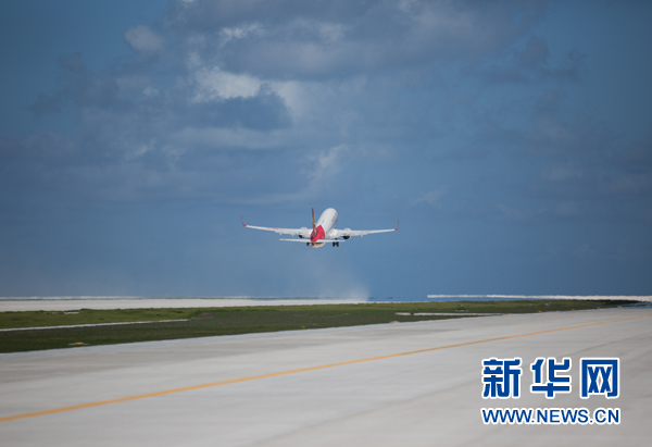 1月6日,海南航空的飞机从永暑礁新建机场起飞,返回海口。当日,中国政府征用的两架民航客机先后从海口美兰机场起飞,经过近2小时的飞行于10时21分、10时46分平稳降落南沙永暑礁新建机场并于当日下午返回海口,试飞成功。永暑礁新建机场位于我国南沙永暑礁上,是我国目前最南端的一座机场。 新华社记者 金立旺摄