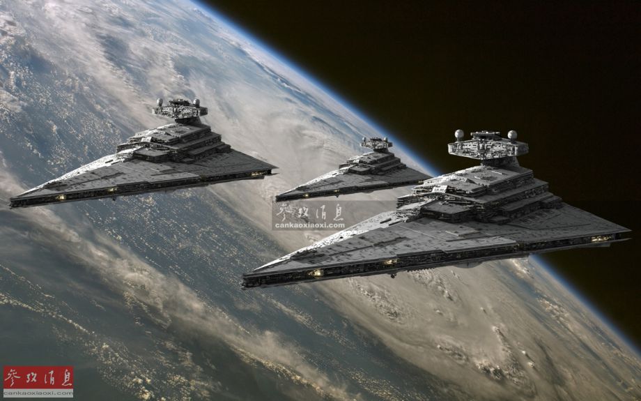 作为《星战》中最具代表性的武器之一,我们先从歼星舰(Star Destroyer)谈起。歼星舰一词来源于早期引进自港台的《星球大战》漫画作品,虽然Destroyer在军事术语中是驱逐舰,但显然直译为“星际驱逐舰”不足以形容歼星舰的恐怖战力,且该词源自“单舰足以能摧毁一颗星球”的构想,而并非表明驱逐舰种。图为银河帝国时期编队航行的帝王级歼星舰特遣队。