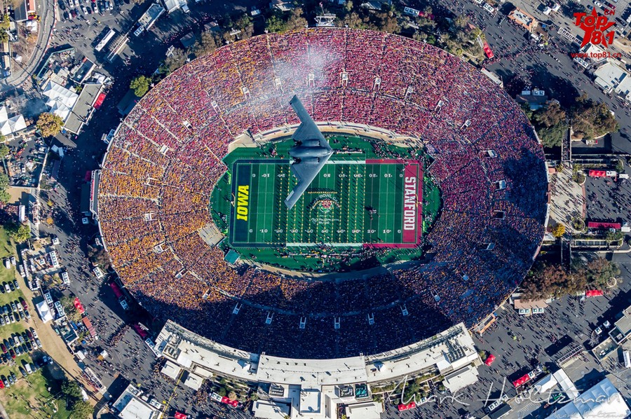 2016年1月1日,一架隶属于密苏里州怀特曼空军基地第509轰炸机联队的B-2幽灵轰炸机助阵第102届玫瑰碗大学橄榄球赛。这场比赛的对阵双方是太平洋十二校联盟冠军斯坦福大学绛红队和西部地区十大联盟冠军艾奥瓦大学鹰眼队。(鸣谢:空军之翼 阿姆斯壮)