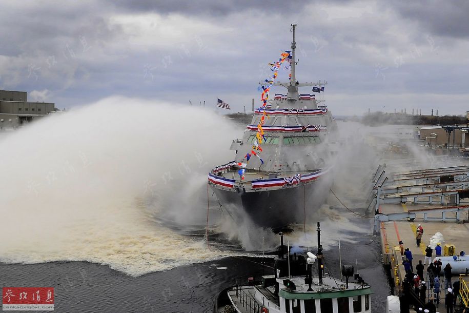 图为美海军“沃斯堡”号濒海战舰下水瞬间。