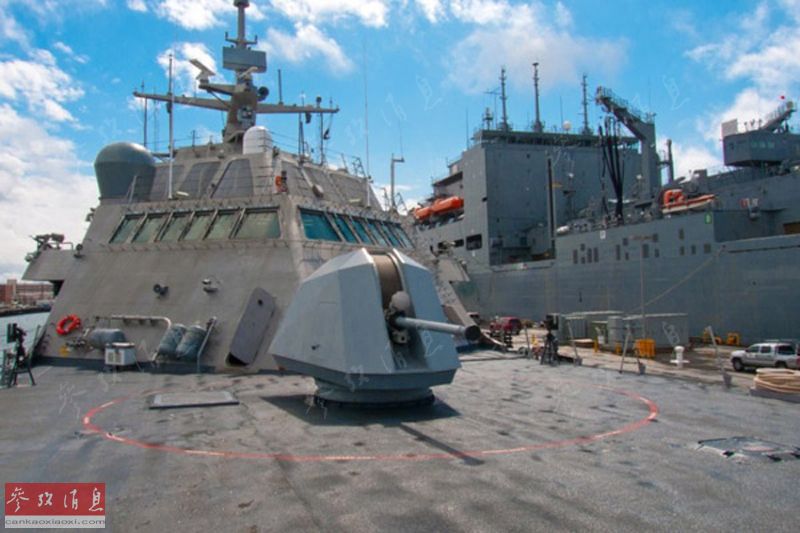 “沃斯堡”号的武器系统包括一门Mk110型57毫米隐身舰炮,一座“拉姆”近防导弹发射器,“地狱火”/“狮鹫”导弹发射器以及2挺12.7毫米重机枪。 美海军“沃斯堡”号舰艏Mk110隐身舰炮。