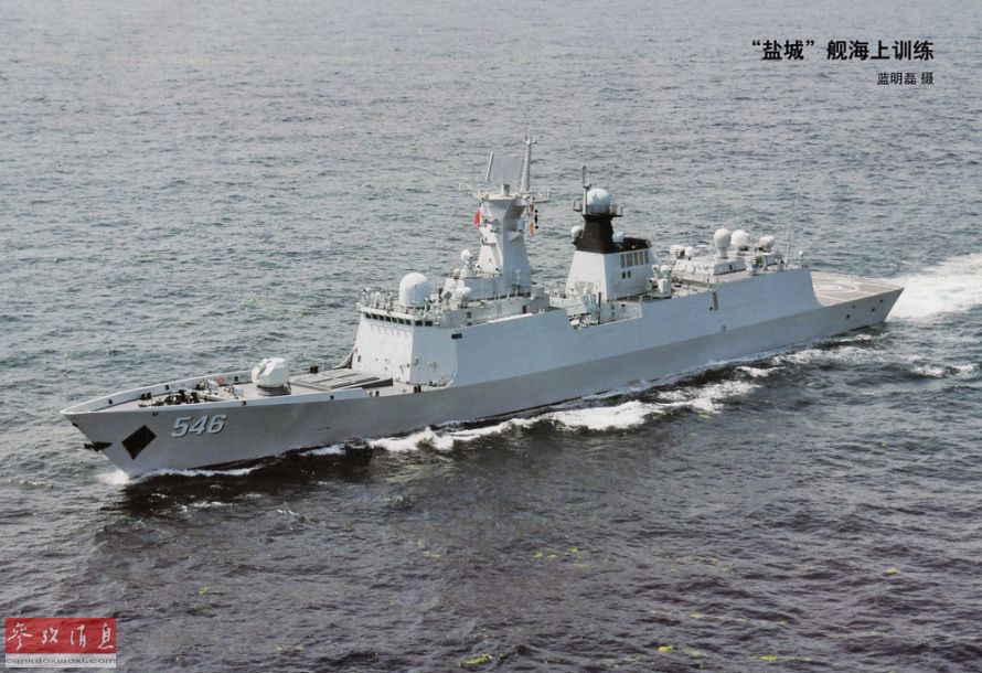 “盐城舰”舰员165人。其武器系统包括1门76毫米舰炮,32单元垂发导弹发射器,2座4联装C-803反舰导弹发射器,2座730型30毫米七管近防炮,2座三联装鱼雷发射器。图为航行中的盐城舰。