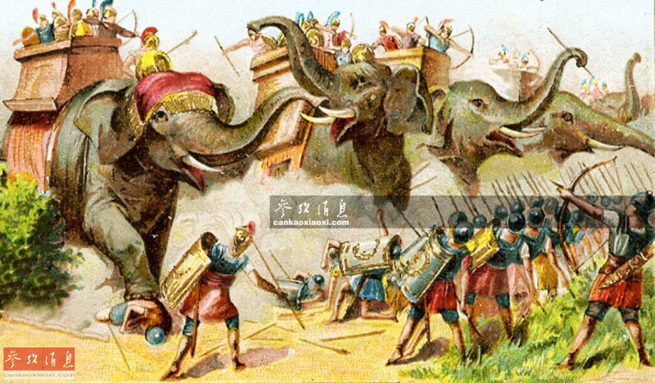 与此同时,罗马人集中数百支喇叭和号角,用震耳欲聋的喧嚣声把大象吓得晕头转向,致使迦太基战象调头回走,在己方步兵和骑兵队伍中造成混乱。
