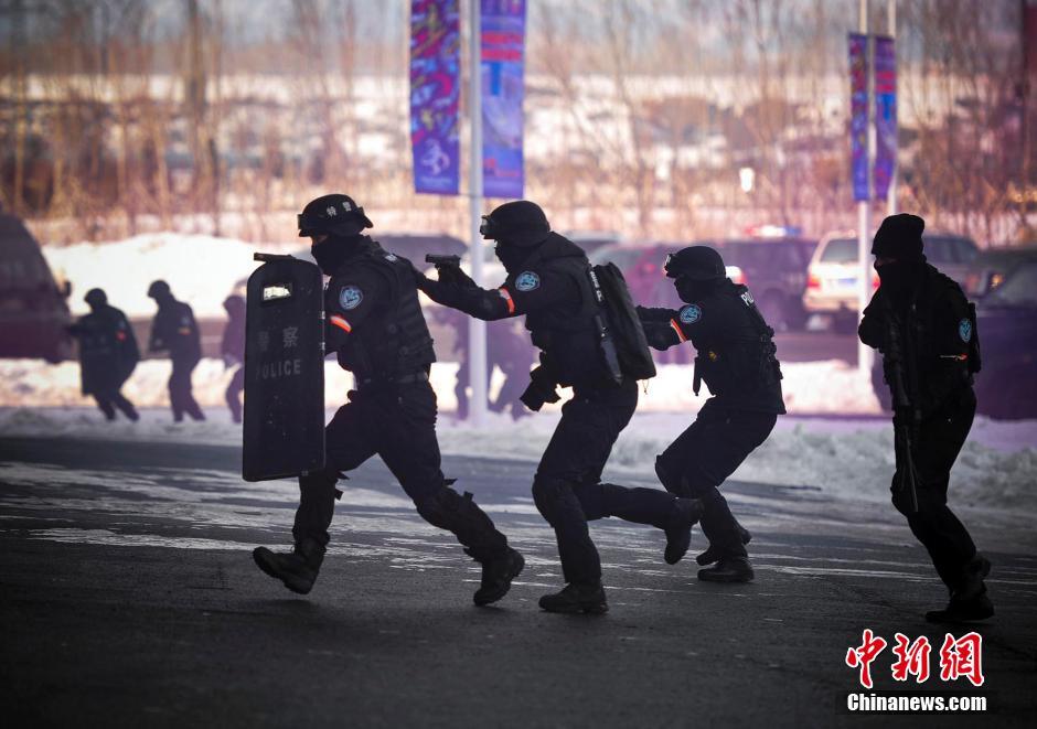 1月7日,新疆乌鲁木齐市公安局特警八支队在第十三届全国冬季运动会举办地,新疆冬季运动管理中心安检口、场馆、附近山地举行处置突发事件应急演练。