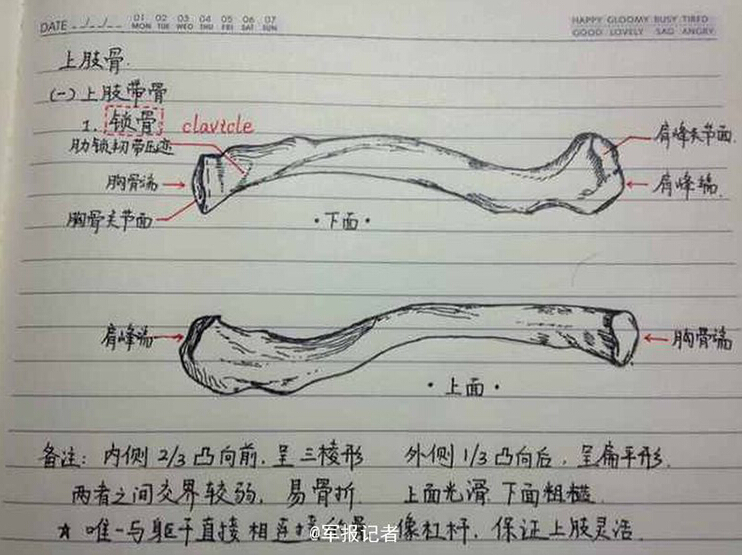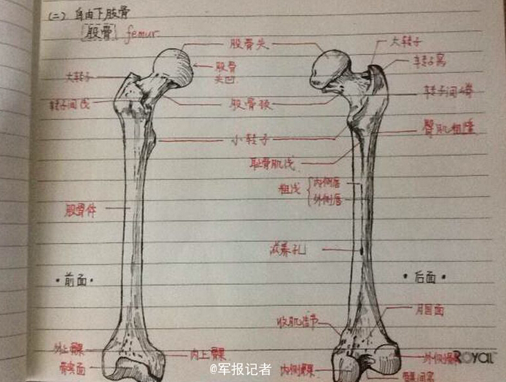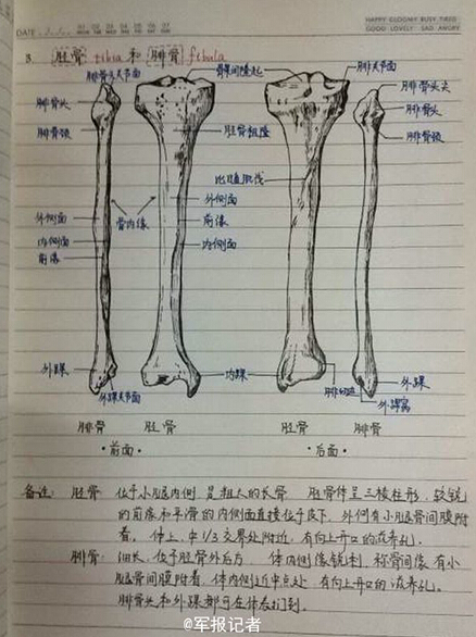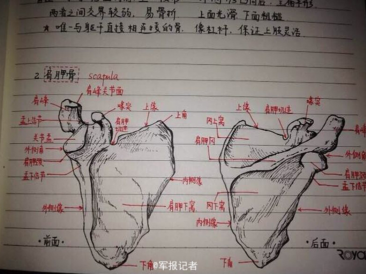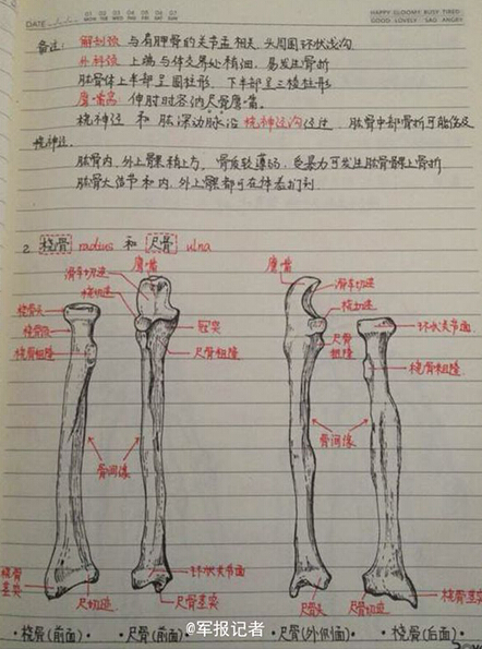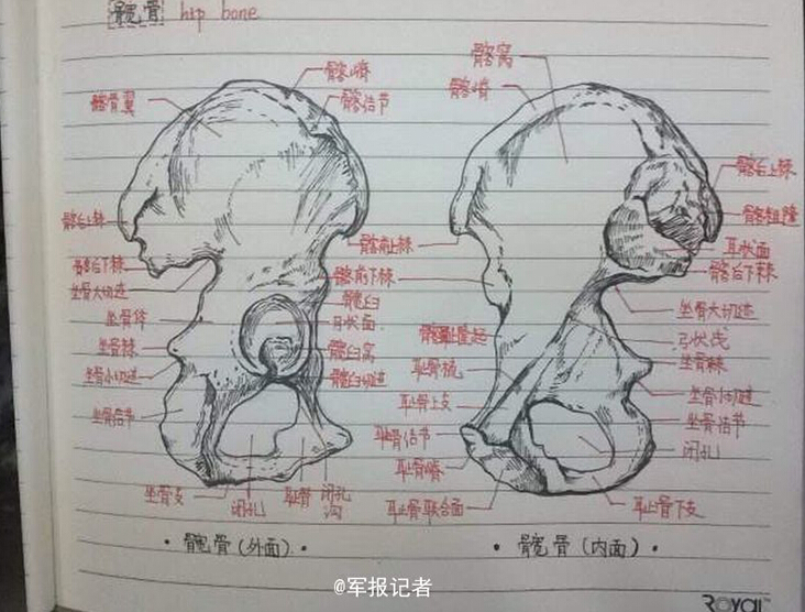 你以为军校学霸只是简单的考试得分出众么?其实,他们平时对自己的要求也是精益求精,从笔记就可见一斑。这些骨骼图似乎成了素描,技术难度一级啊。这就是第三军医大学的学霸们的作品,快感受一下!