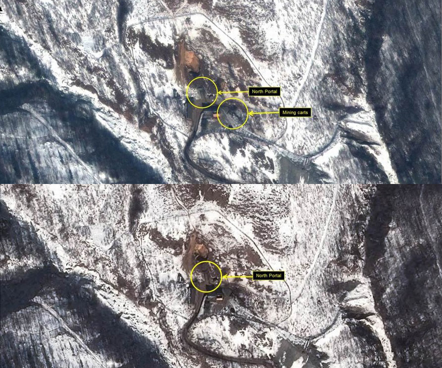 1月7日,美国霍普金斯大学北纬38度线研究所发布朝鲜核试验后的卫星照片。美方对比1月1日拍摄的丰溪里核试验场照片后发现,最新的核试验并没有造成任何地表环境变化。图为1月6日卫星照(上)与1月1日卫星照(下)对比。