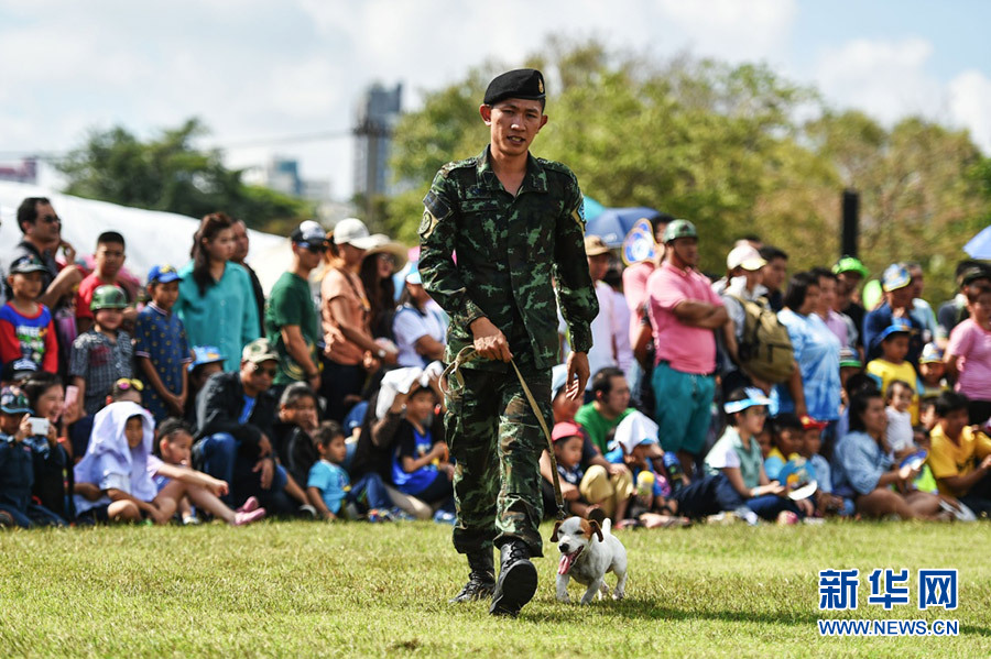 1月9日,在位于曼谷北部的泰国陆军第二装甲师驻地,一名士兵带着自己训练的军犬为前来参观的民众表演节目。