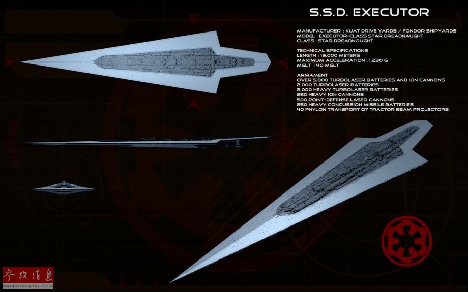 在星战正传第二部《帝国反击战》中,银河帝国投入了比帝王级歼星舰更恐怖的超级歼星舰(SSD)“执行者”号,该舰是著名的黑武士—达斯·维德的旗舰。“执行者”号开启了超无畏舰时代。SSD不论是在整体作战性能、还是在尺寸上都要远高于普通歼星舰。