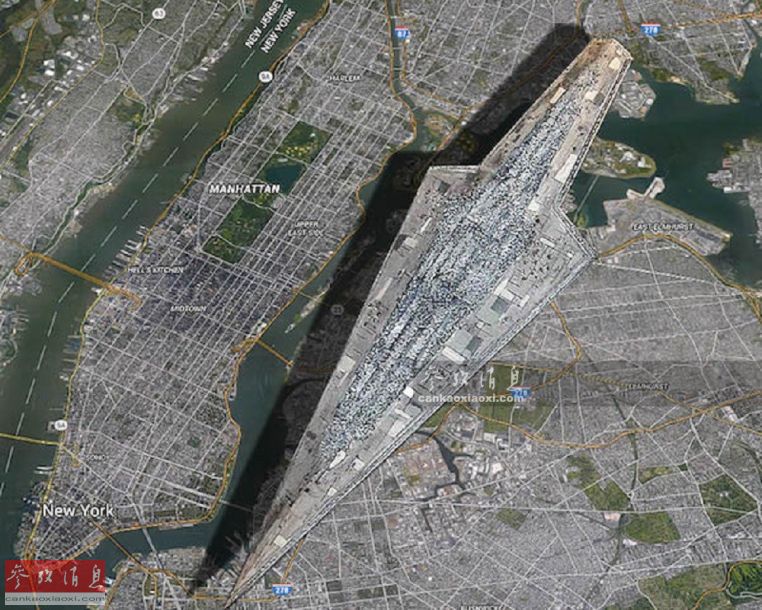 图为“执行者”号与现实中纽约曼哈顿岛的尺寸对比。