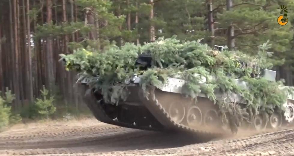 使用杂草和树枝伪装的波兰陆军豹2A5主战坦克
