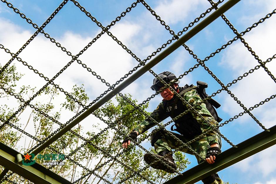 特战队员正在穿越空中软网。