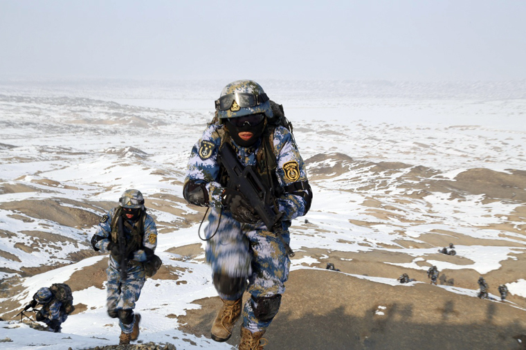 海军陆特战部队利用严寒天候条件和荒漠地貌环境组织进攻训练(1月10日摄)。