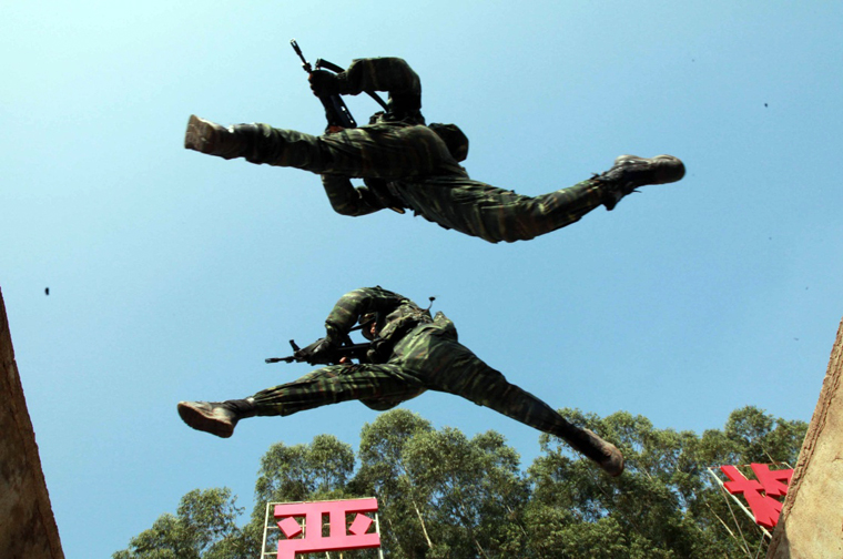 武警特战队员进行快速穿越障碍训练(1月5日摄)。
