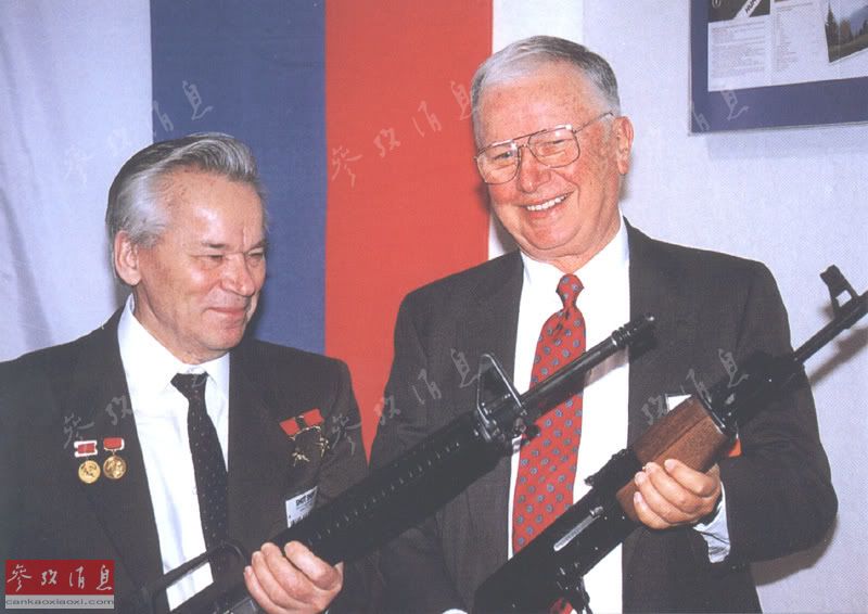 20世纪60年代,美国著名枪械设计师尤金·斯通纳又为柯尔特公司开拓了又一新领域,由他设计的AR-15系列小口径自动步枪,于1962年进入美军服役,军用编号为M16,仅一年之后,美军特战部队就在越南南部使用这种步枪参加实战,随着越战的爆发,这种步枪也声名鹊起。图为两位“枪王”,手持AK-47的斯通纳(左),与手持M16的卡拉什尼科夫合影。
