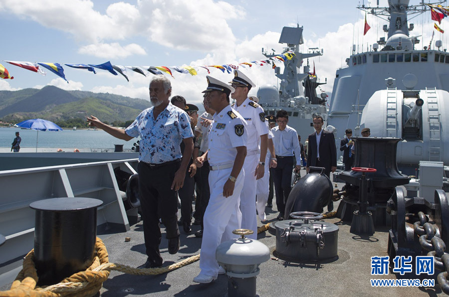 1月17日,在东帝汶首都帝力,东帝汶前总统沙纳纳·古斯芒(左)参观中国海军编队。