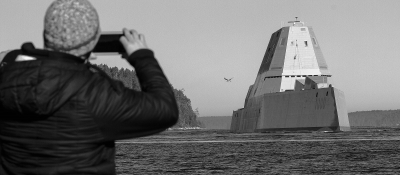 朱姆沃尔特级驱逐舰首次海上试航,引来美国民众竞相围观。