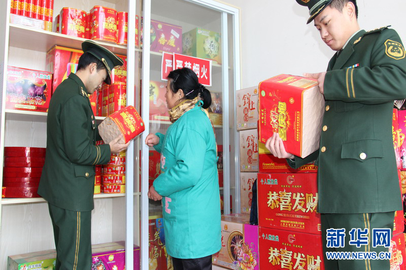 官兵对烟花爆竹经营点内的烟花爆竹进行检查