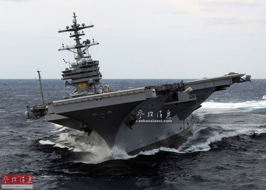 图为正面拍摄的,正在进行高速转向测试的“布什”号核航母。