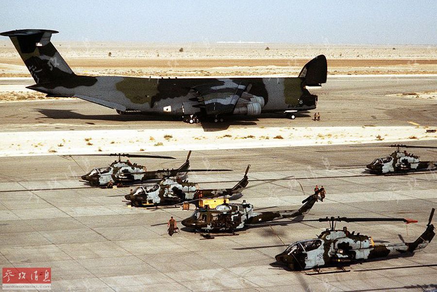 图为1991年1月23日(海湾战争期间),部署在沙特靠近伊拉克边境的某空军基地的陆战队AH-1W和UH-1N直升机群,远处还有一架C-5运输机在装卸物资。