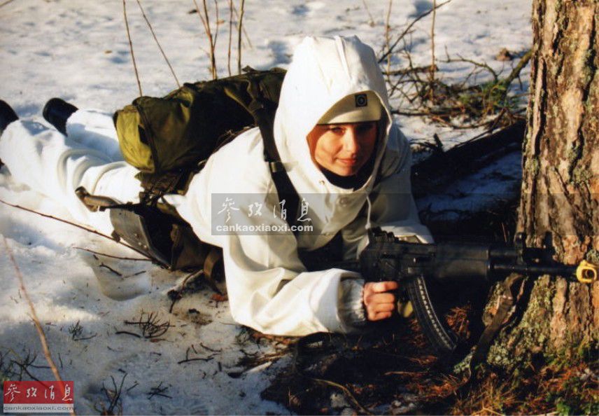 芬兰女兵着雪地伪装服训练。