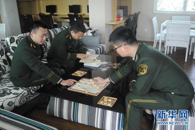 官兵在“休闲乐园”下棋看书