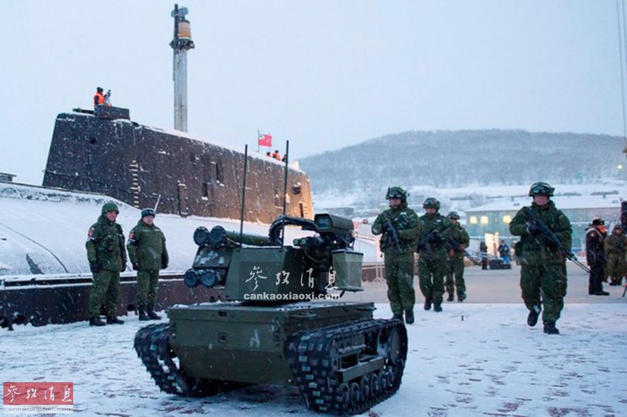 图为俄军步兵与“平台”M无人战车一同在潜艇基地执行警备任务。