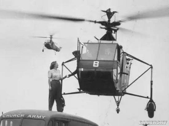 1945年在安杜佛英国皇家空军直升机学校,一名Church Army教会工作者递了一杯茶给悬停的西科斯基R-4直升机飞行员。虽然不是飞机,R-4是世界上第一架大规模生产的直升机,也是美国陆军航空部队和英国皇家空军和皇家海军使用的第一架直升机。