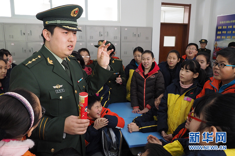 官兵为学生讲解燃放烟花爆竹的注意事项