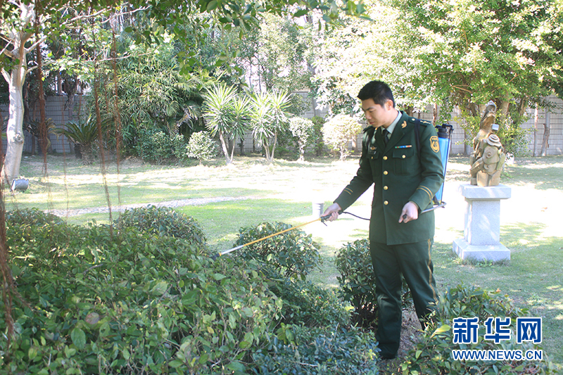 边防官兵对营区进行消毒