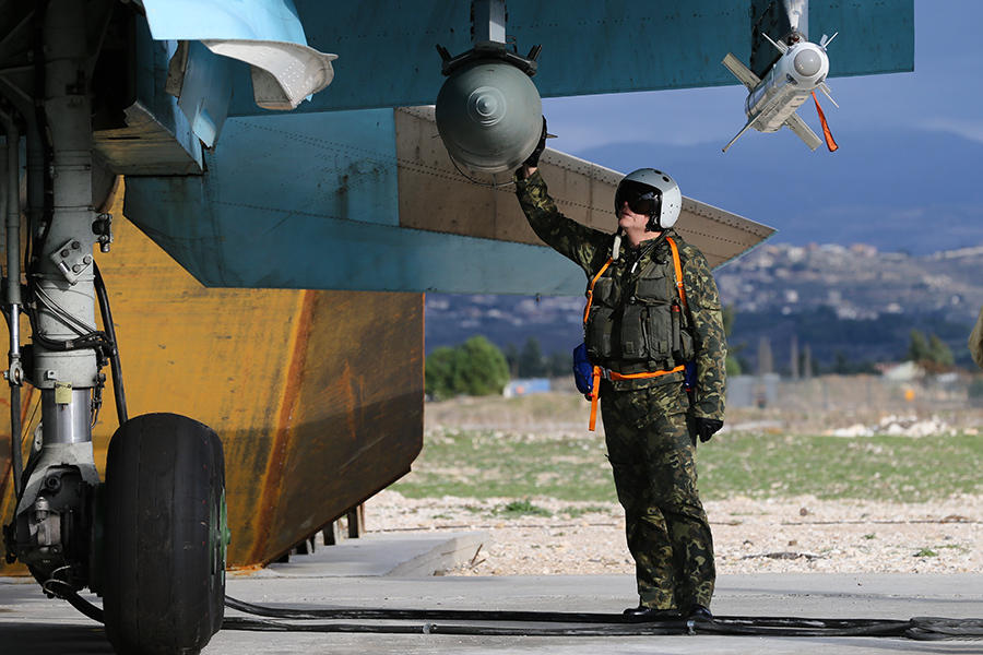 俄空天部队飞行员正在检查战斗机上所挂载的炸弹。