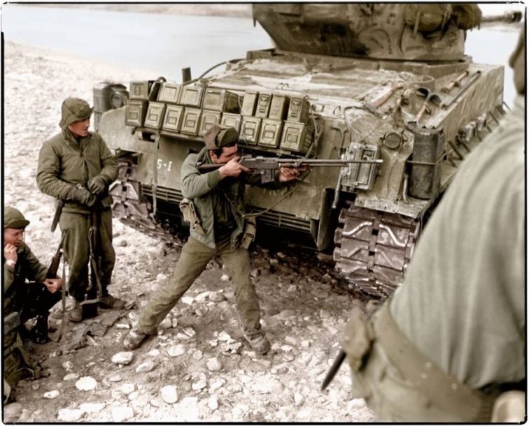 美军士兵使用BAR轻机枪依托坦克开火。